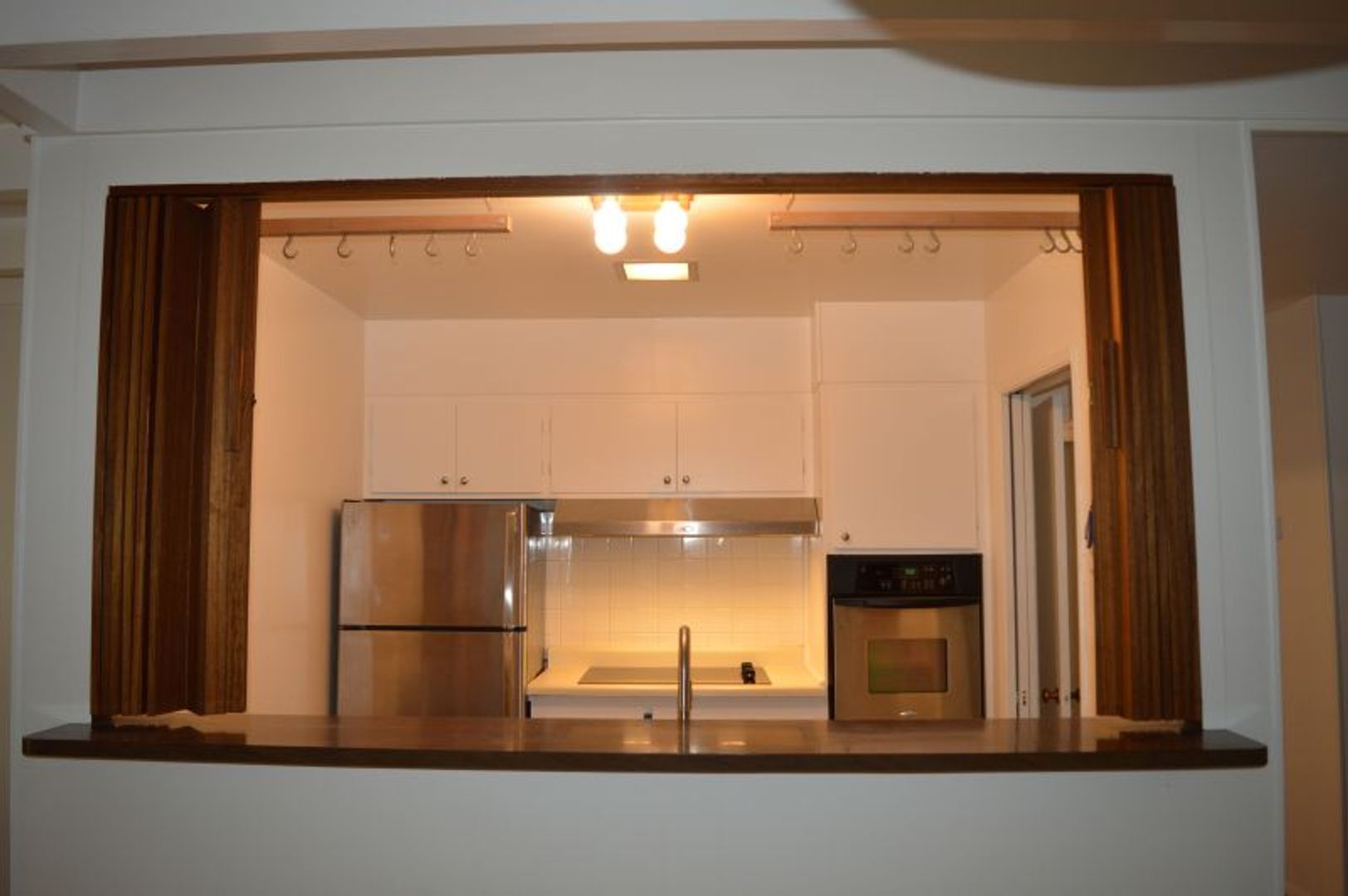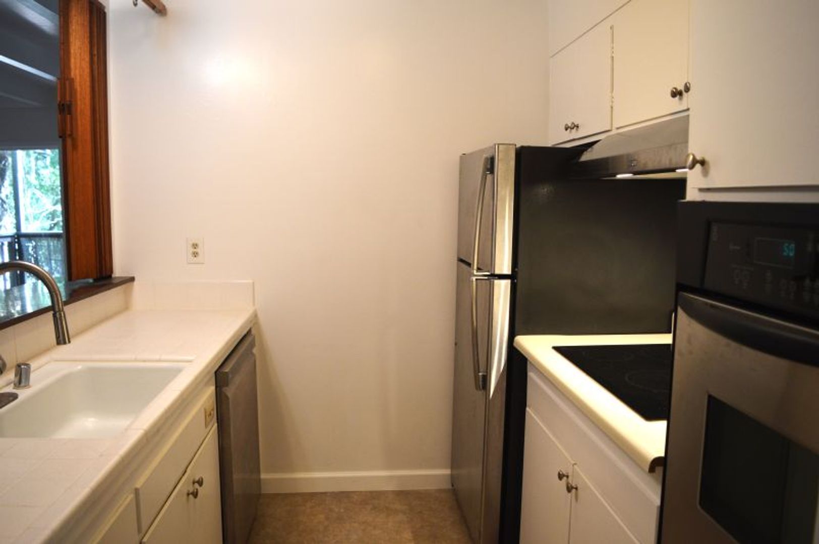 Spacious unit features large living/dining room with hardwood floor and open-beam ceiling, wood-burning stove and sliding door to an expansive deck with tree-filled view. Galley kitchen with stainless appliances and pass-through/breakfast bar.