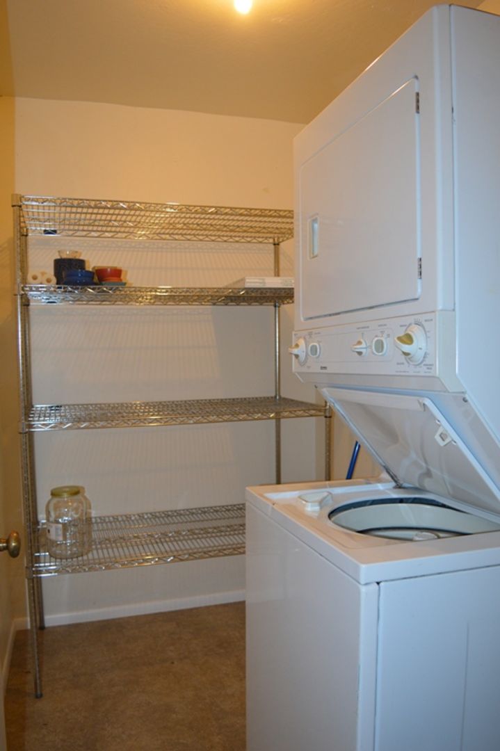 Nice sized primary bedroom with 2 closets and sliding door to deck, second bedroom with large closet. Bathroom includes shower over tub and linen cabinets. Laundry room with stacking washer/dryer and additional storage shelving.