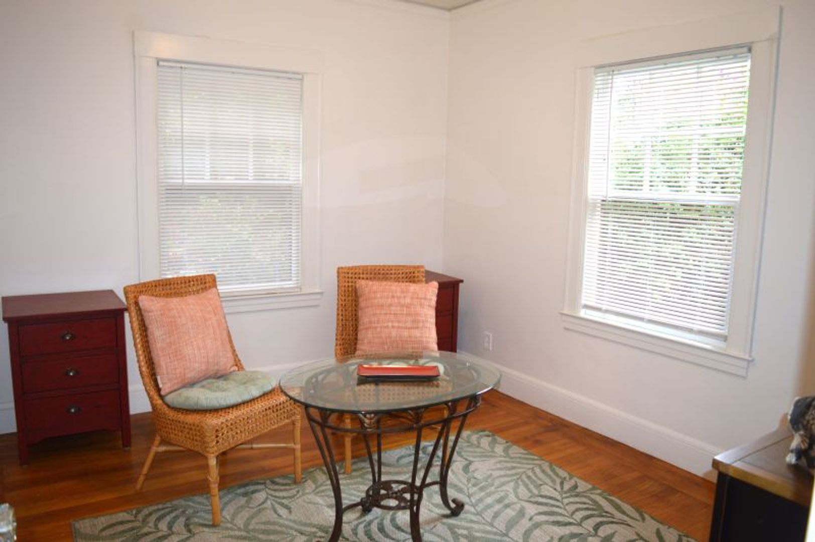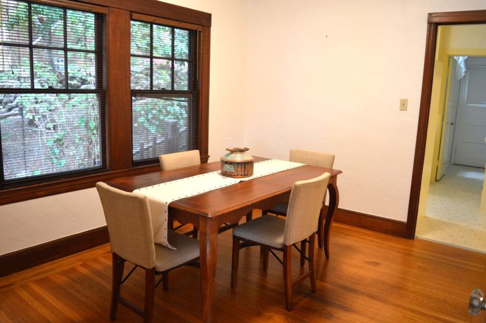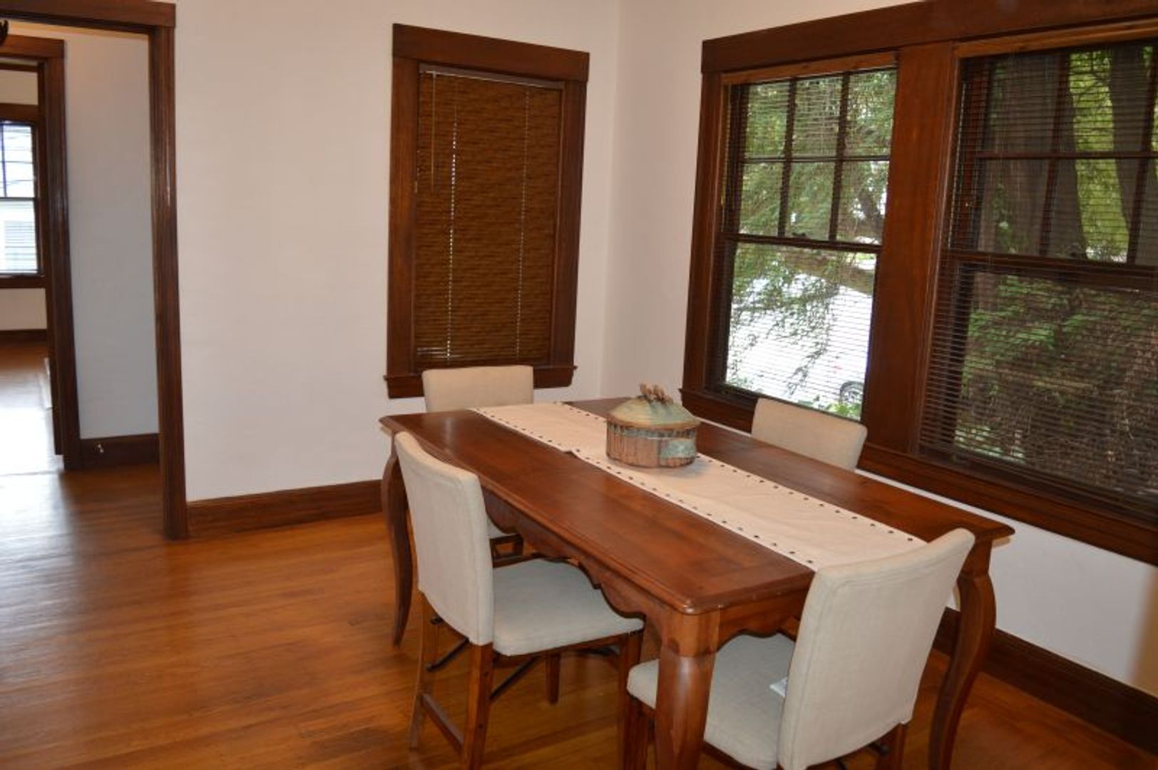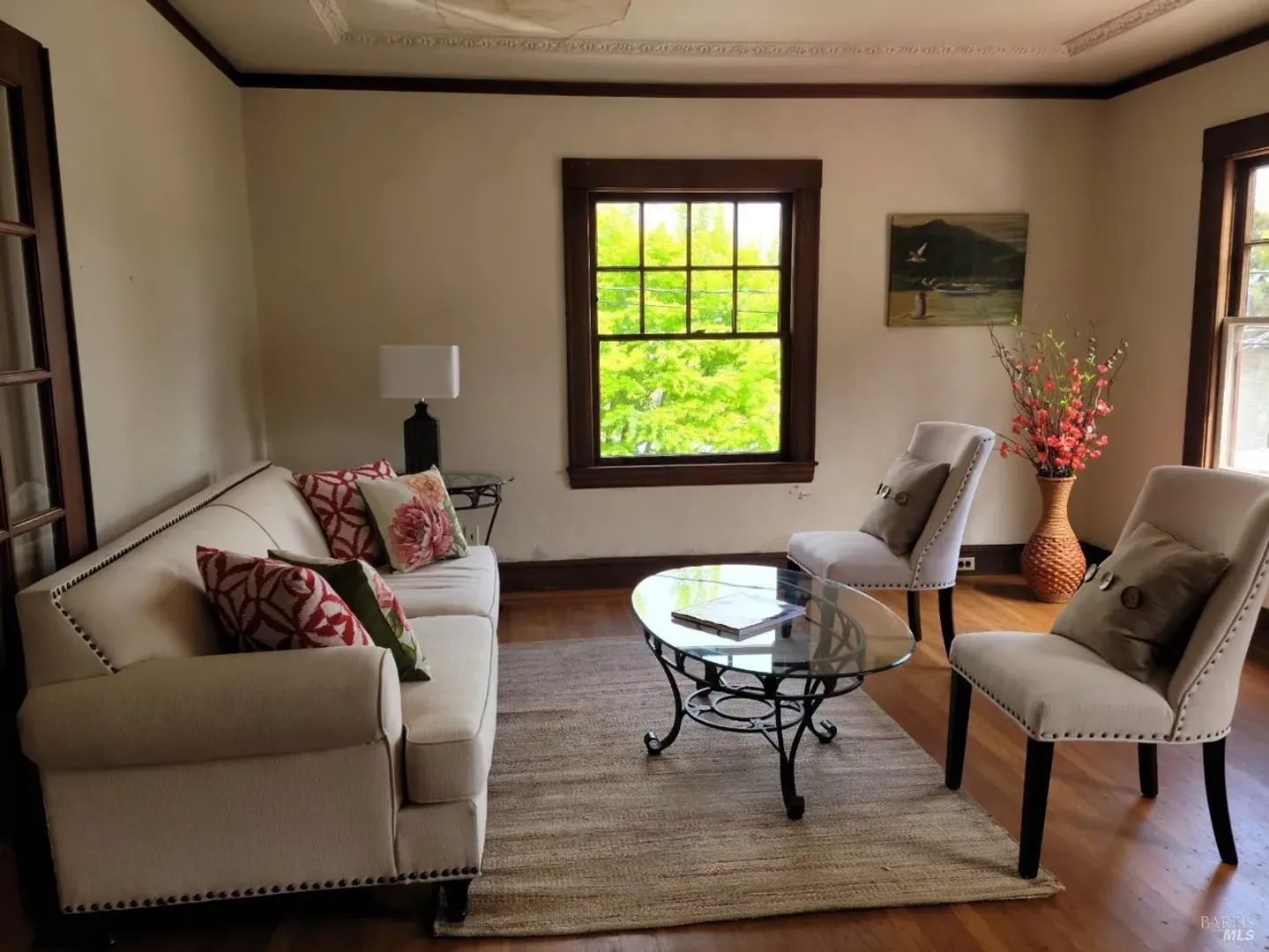 The house has lots vintage charm, including beautiful oak hardwood floors throughout. A large living room with mullioned French doors, tray ceilings and decorative tile fireplace and separate formal dining room with wood crown molding and wood trim. Adorable farmhouse style kitchen with gas range. Two bedrooms and a bonus office/bedroom downstairs. Washer and Dryer included. Featuring a 1-car garage, providing secure parking and additional storage space. Step outside to the garden patio/yard, a perfect spot for outdoor relaxation and deer watching.
